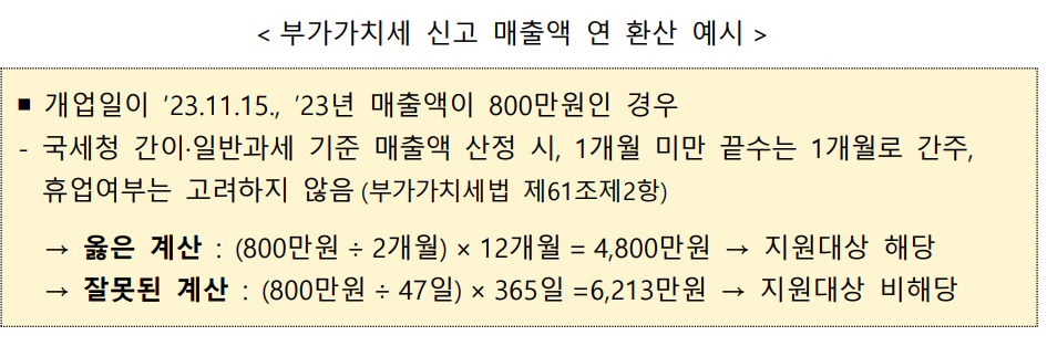 특히, 개업일이 2023년 12월 31일 이전이며, 2024년 2월 15일 공고일 기준으로 폐업 상태가 아닌 경우에 지원 대상에 포함됩니다. 연 매출액 기준은 2022년 또는 2023년 부가가치세 신고 매출액을 기준입니다.