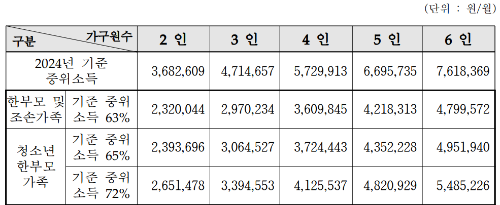 비록 부모 양쪽 중 한 명이 없다고 하더라도 소득이 높다면 지원받지 못할 수 있습니다. 이렇듯 한부모 가정의 조건 중 하나는 기준중위소득을 일정 기준 이하여야 한다는 것입니다.