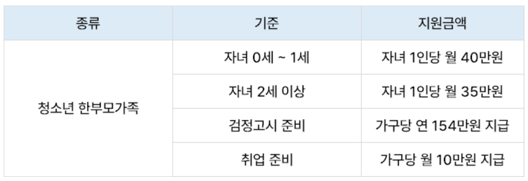 청소년 한부모가족의 경우에는 또 다른 지원이 있습니다. 자녀가 0세 ~ 1세인 경우 자녀 1인당 40만 원을 지원합니다. 2세 이상의 자녀는 1인당 35만 원이 추가로 지원됩니다.
