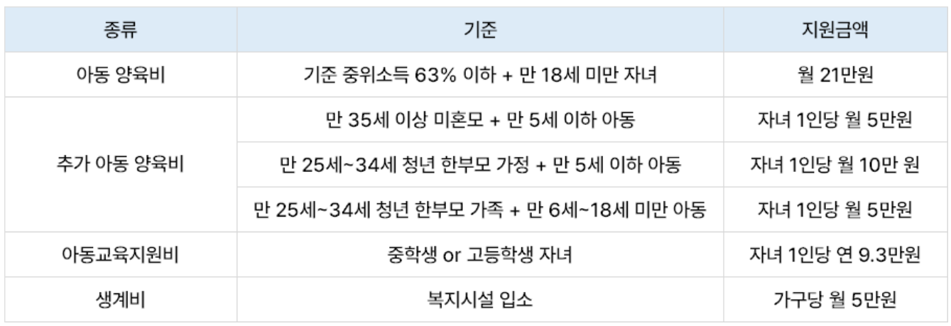 가장 기본적인 지원 혜택으로 18세 미만 자녀 1인당 매월 21만 원의 아동양육비가 지원됩니다. 21만 원 별거 아닌 거 같아도 실제적으로 큰 도움이 될 수 있겠죠. 추가적으로 부모의 구성이나 나이, 아동의 나이에 따라서 추가 아동양육비가 지원됩니다. 표로 구성하면 아래와 같습니다.